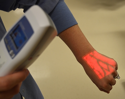 Patient Care Services Clinical Education Director Cynthia Edwards, RN, said, “With most very ill patients, the first treatment or action taken in the ER, and on the nursing floors is to collect a blood specimen and/or insert an IV to administer fluids or provide drug administration quickly into the blood stream. That can be difficult with some of our more fragile patients. The AccuVein shines a light on the surface of the skin and the veins become visible, which makes it easier to find them.”